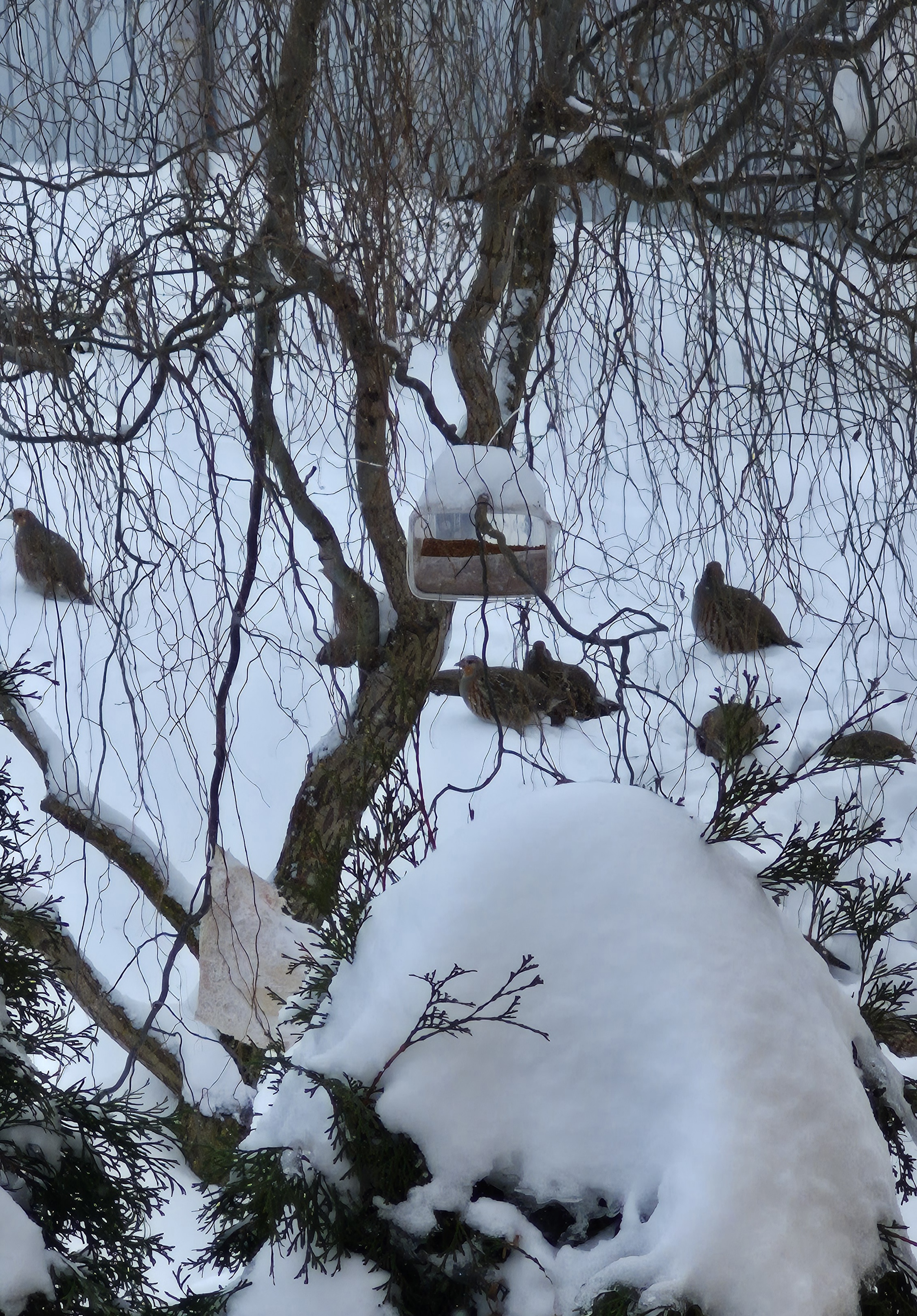 Они такие прикольные! Воробьев и синиц гоняют. Воробьи орут на них. По снегу прям плывут. Лапками снегу разгребаю. Потом в кучку собираются и отдыхают.