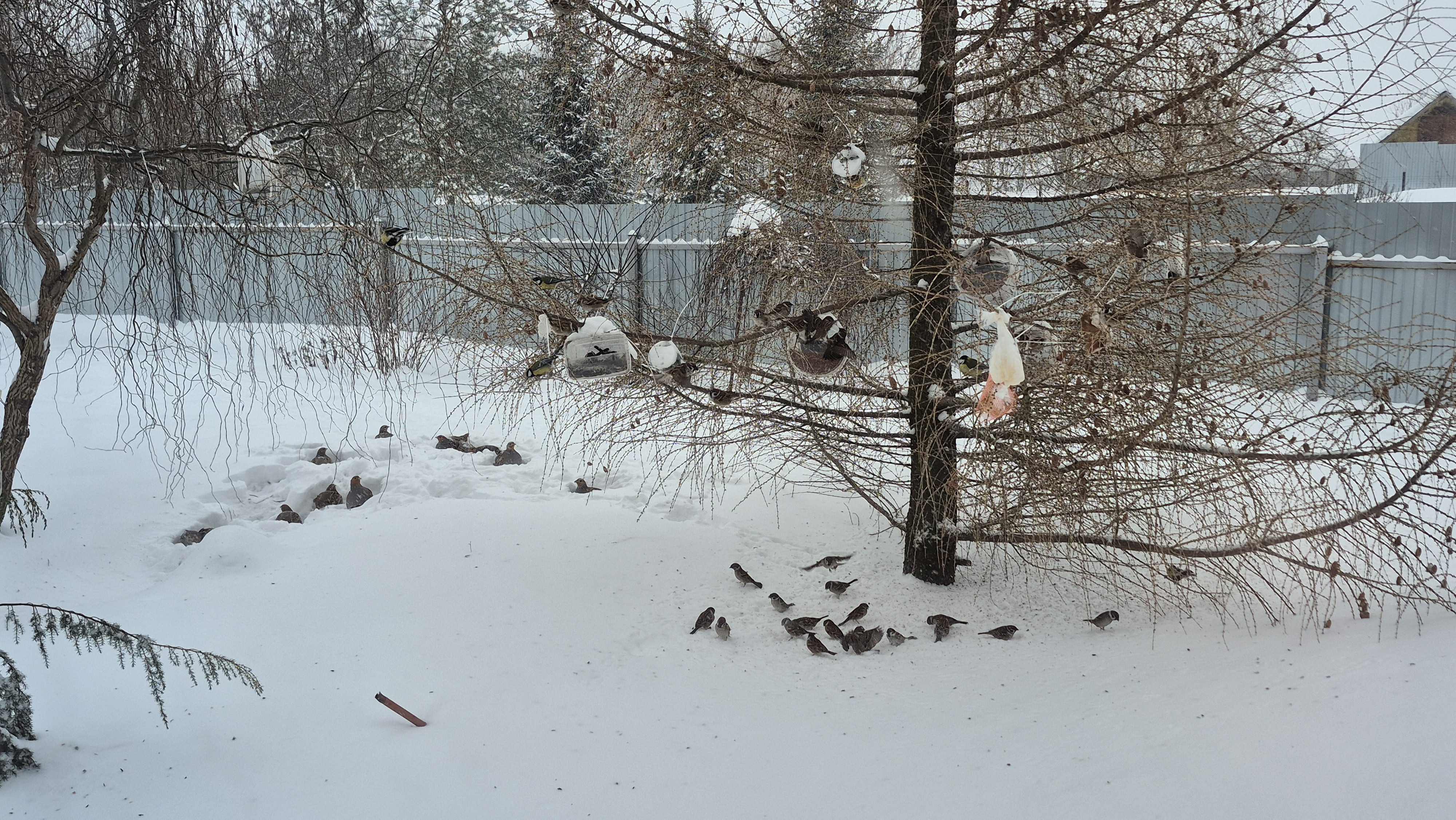 У меня висят кормушки с просом и семечками. Когда воробьи дерутся, из кормушки летит во все стороны. Вот они под кормушками собирают. Сейчас буду им сыпать семена на снег.