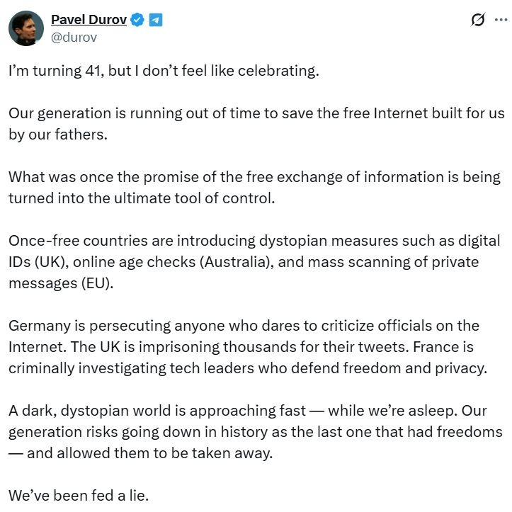 Итак, Дуров предупреждает что темный, дистопичный мир приближается, и наше поколение рискует быть последним, у кого был свободный интернет. Обратите внимание на государства, которые он упоминает.