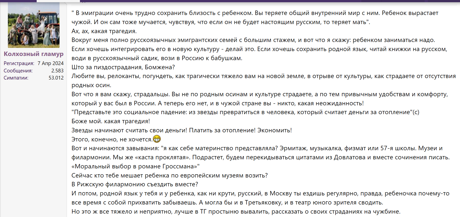 Такое неприкрытое злорадство насчёт релркантов, которые "тут никто" и удобств никаких ждать не должны.