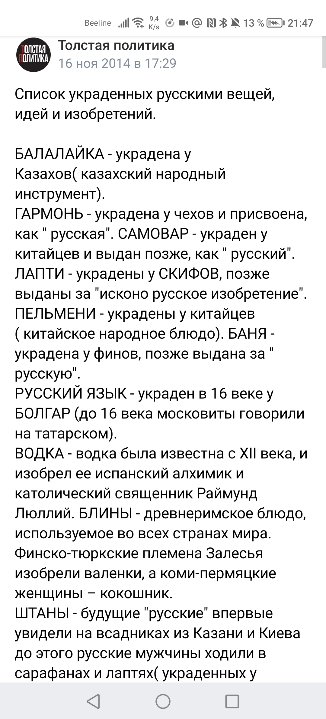 Борщ украинский? Ну ок, пускай. Я его люблю, варю и буду есть. Как меняется вкус моего борща от знания, кто его изобрёл?Отредактировано Филипп Филиппыч (Сегодня 22:08:44)