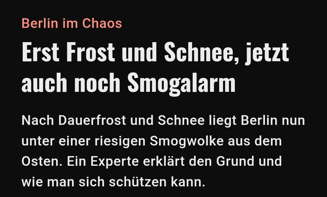 Ну чО, в то время, как наши немецкие корабли бороздят просторы политики повышают нам, жителям Германии, налог на выхлоп со2, рушат аэс и всячески спасают планету (нет), Берлин в добавок с жуткому снегопаду нахлобучило смогом. У нас конечно по холодку случается туман, но это не то, это именно смог, который приносит из Польши и Чехии. Они там, ввиду холодов, углём-с топят. Да.