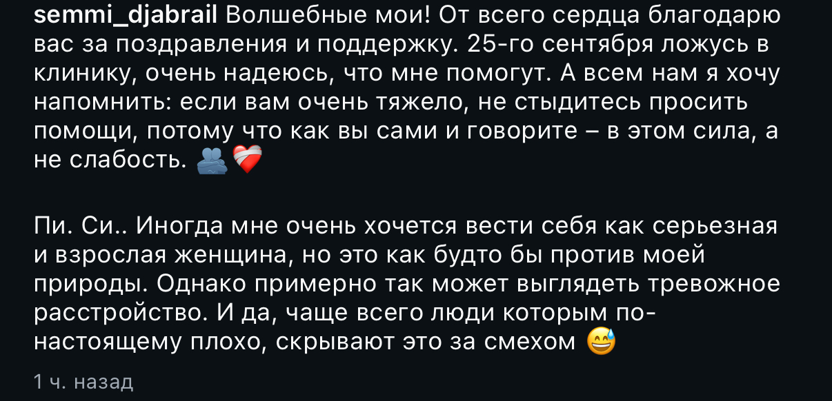 Кстати, я тут еще немного подумала насчет ее псих проблем. Ей поставили только птср и тревожку. На птср с ее травмой вообще изи наговорить, и мне кажется, какого-то сильного птср у нее нет, как бывает у людей, которые в боевых действиях участвовали.