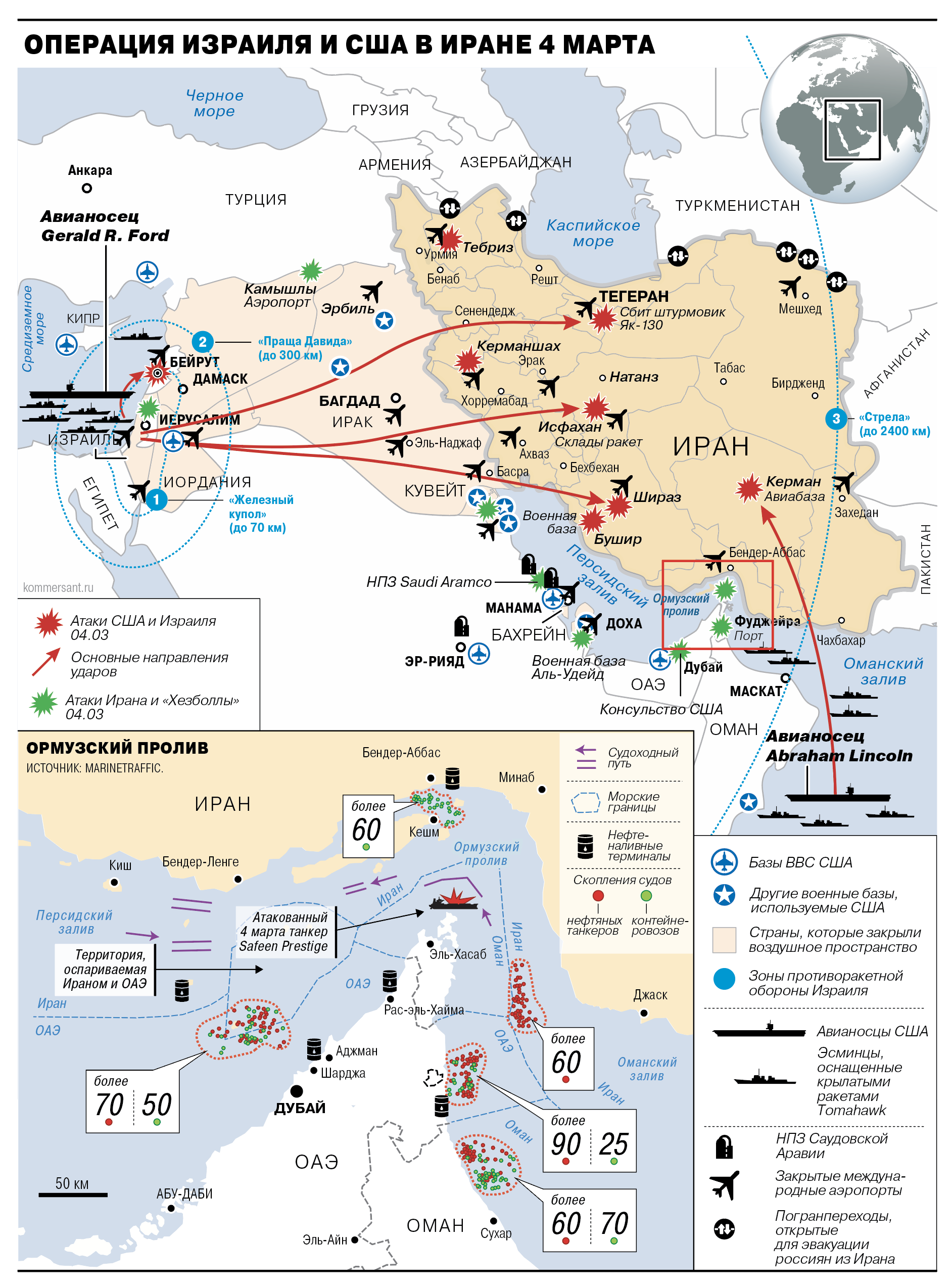 То, что Иран на пятый день войны сохранил способность наносить ответные удары, продемонстрировали продолжавшиеся прилеты в странах Ближнего Востока. Удары были нанесены по консульству США в Дубае и порту в городе Фуджейра (ОАЭ). Впервые о перехвате иранских ударов заявила Турция, которая, согласно официальному заявлению, уничтожила баллистическую ракету на подлете к своей южной границе. Удары иранских ракет были зафиксированы и в Сирии.В этой связи США и Израиль рассчитывают, что в скором времени в войну вступят страны Персидского залива. Саудовская Аравия всерьез рассматривает варианты ограниченных ударов по Ирану, сообщила вечером 3 марта новостная корпорация Kan со ссылкой на израильские источники. «Мы не сомневаемся, что Саудовская Аравия вскоре нападет на Иран, после того как сама подверглась нападению»,— сказал один из собеседников Kan.