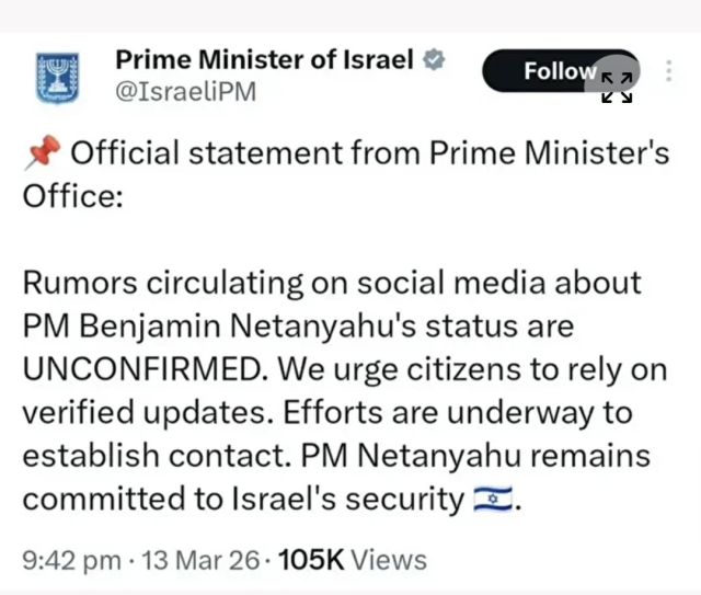 Израильский журналист в видео, снятом на фоне обломков дома, разрушенного иранскими ракетами, заявил, что Нетаньяху погиб. Однако этот пост был удален вскоре после публикации. Также в официальном аккаунте премьер-министра Израиля в социальных сетях было размещено сообщение: "Мы продолжаем прилагать усилия, чтобы связаться с ним", что привлекло внимание. Этот пост также был удален вскоре после публикации.