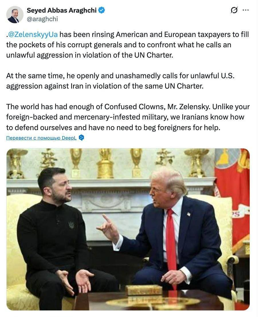 «Миру надоели запутавшиеся клоуны, господин Зеленский. В отличие от вашей армии, поддерживаемой из-за рубежа и кишащей наёмниками, мы, иранцы, знаем, как себя защитить, и нам не нужно умолять иностранцев о помощи», — написал в соцсетях Аракчи.