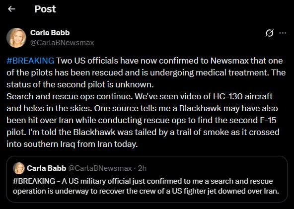 🔻Ранее сообщалось, что пилот американского истребителя после катапультирования оказался на территории Ирана и, предположительно, был захвачен силами страны. Самолет, по информации иранских СМИ, был уничтожен подразделениями Корпуса стражей исламской революции. Речь, по некоторым данным, идет об истребителе F-35, однако издание американское издание TWZ сообщает, что крушение потерпел F-15.