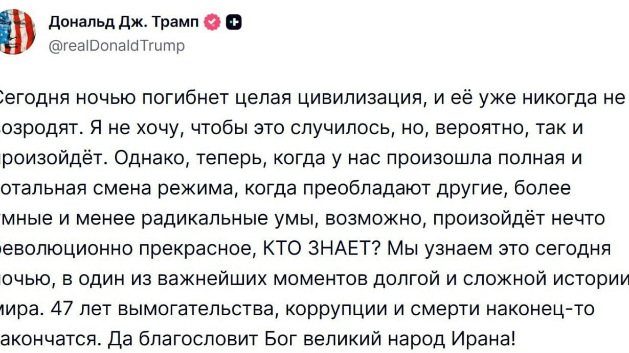 Президент США Дональд Трамп в своей соцсети угрожает Ирану, обещая «гибель целой цивилизации».«Сегодня ночью погибнет целая цивилизация, и её уже никогда не возродят. Я не хочу, чтобы это случилось, но, вероятно, так и произойдёт.