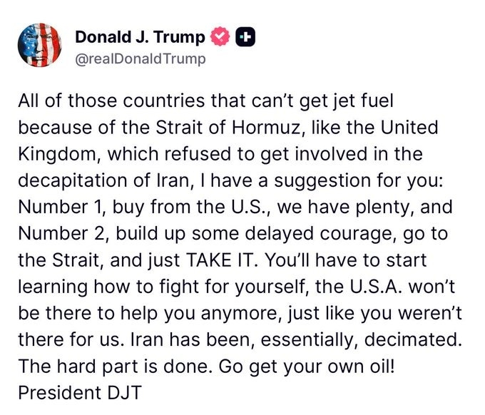 "Всем тем странам, которые не могут получить авиационное топливо из-за Ормузского пролива, как, например, Великобритания, отказавшаяся вмешиваться в обезглавливание Ирана, у меня есть для вас предложение: