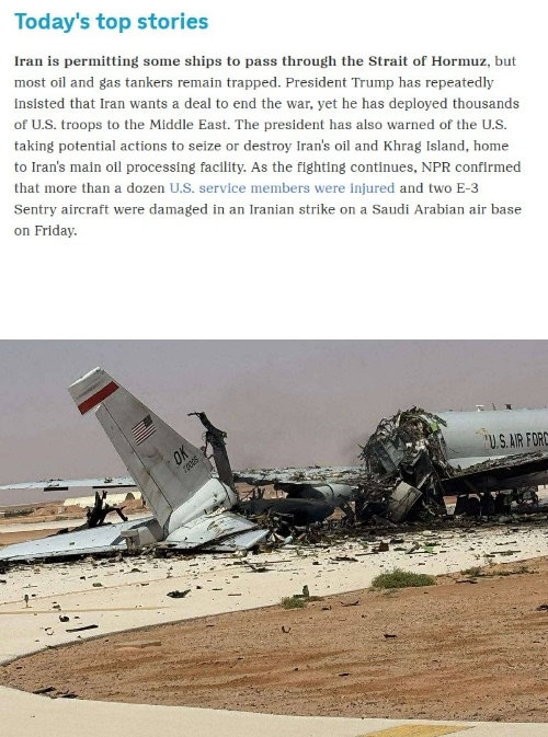 "По мере продолжения боевых действий, более десятка американских военнослужащих получили ранения, а два самолета E-3 Sentry были повреждены в результате иранского удара по саудовской авиабазе в пятницу", — сообщает радиостанция.