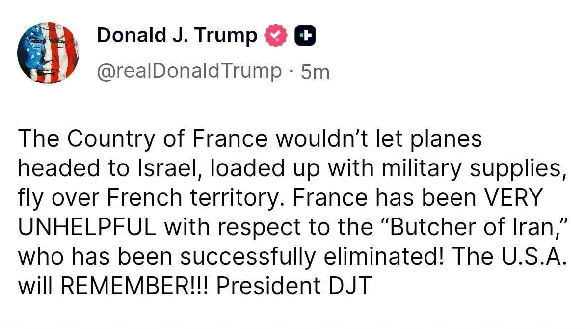 "Франция была крайне неполезной в отношении «Мясника Ирана», который был успешно ликвидирован! США это запомнят!" - написал президент США.
